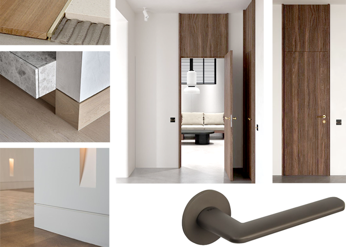 Portas em madeira, com bandeira fixa até ao teto. Puxadores do tipo Tupai, com fechadura sem chave, roseta circular, cor titânio e dobradiças ocultas. Rodapé embutido em madeira ou à cor do revestimento.