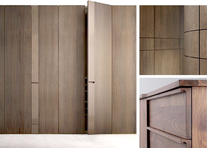 Roupeiros com portas em madeira, com puxadores salientes na mesma cor. Apontamentos de contraste entre acabamentos mate e acetinado.