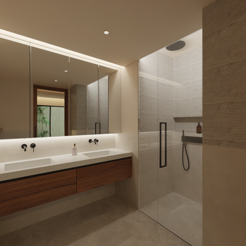 Casas de Banho com mobiliário com acabamento em madeira. Bancadas e lavatórios em solid surface, em tonalidades bege ou cinza. Torneiras em tons titânio ou latão escovado. Revestimento de paredes em cerâmicos de grandes dimensões e pintura para ambientes húmidos. Pavimento em cerâmico com peças de grandes dimensões em tonalidades bege ou cinza. Loiças sanitárias bege, caleira de duche de pavimento e cabine em vidro.
