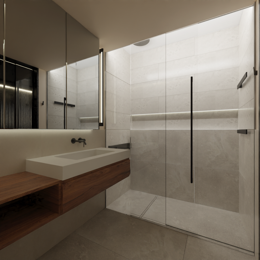 Casas de Banho com mobiliário com acabamento em madeira. Bancadas e lavatórios em solid surface, em tonalidades bege ou cinza. Torneiras em tons titânio ou latão escovado. Revestimento de paredes em cerâmicos de grandes dimensões e pintura para ambientes húmidos. Pavimento em cerâmico com peças de grandes dimensões em tonalidades bege ou cinza. Loiças sanitárias bege, caleira de duche de pavimento e cabine em vidro.