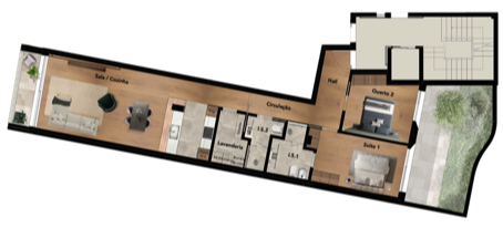 Sala com vista para pátio ajardinado privado