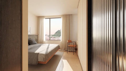 Roupeiros com portas em madeira, com puxadores salientes na mesma cor. Apontamentos de contraste entre acabamentos mate e acetinado. Suite com ligação directa ao terraço e vista panorâmica sobre o Castelo de Leiria