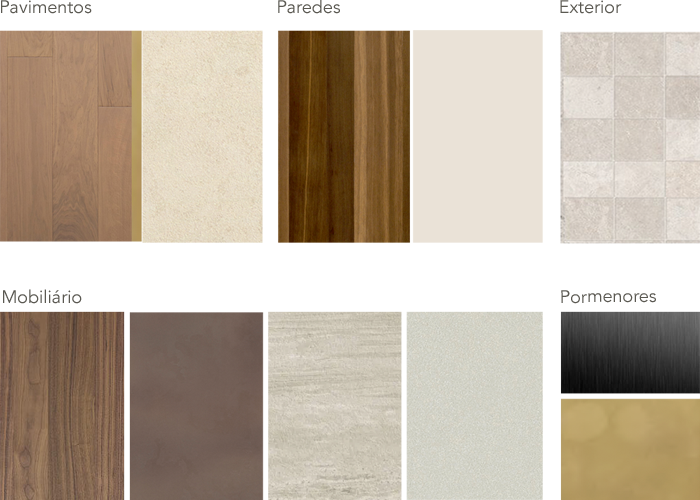 Pavimentos em madeira e mosaico. Revestimentos em painéis folheados e reboco pintado. Pavimentos exteriores em mosaico antiderrapante. Mobiliário fixo com laminados anti-dedadas e compósito de pedra.