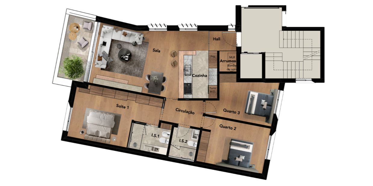 Áreas interiores: Sala / Cozinha 43,5 m2 | Suite 19,6 m2 | Quarto 2 15,2 m2 | Quarto 3 12,7 m2 | I.S. 1 5,2 m2 | |.S. 2 4,0 m2 | Arrumos 1,7m2