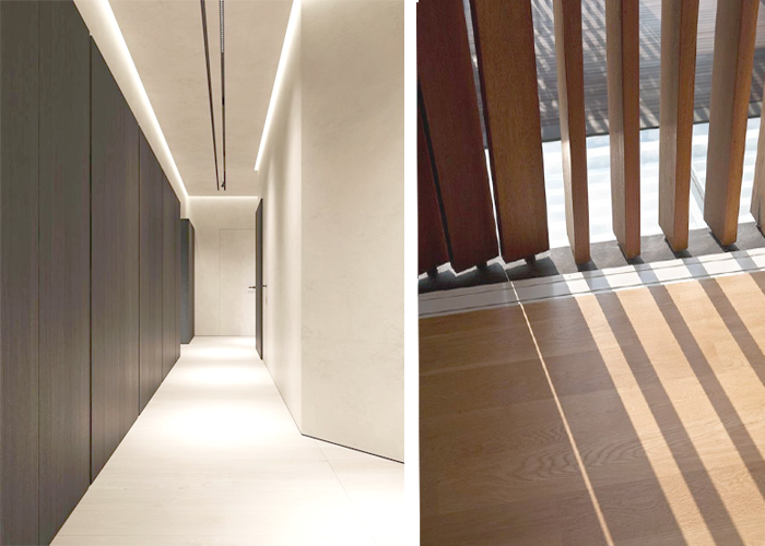Revestimento em painéis com acabamento de madeira e pintura. Iluminação em perfil led, portas ocultas faceadas com a parede. Porta pivotante em zona de circulação.
