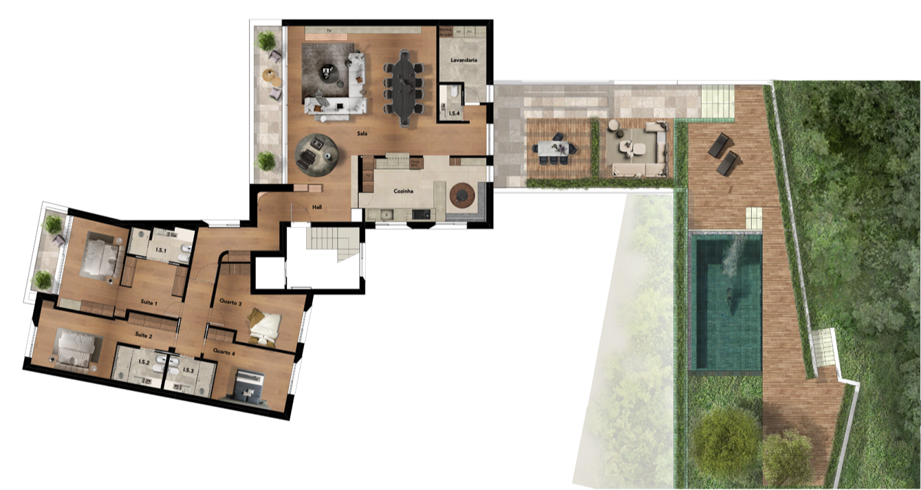Áreas exteriores privadas: Varandas e Terraço 78,3 m2 | Jardim 236,1 m2 | Piscina 28,5 m2
