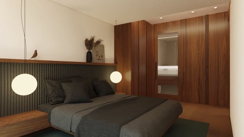 Roupeiros com portas em madeira, com puxadores salientes na mesma cor. Apontamentos de contraste entre acabamentos mate e acetinado.