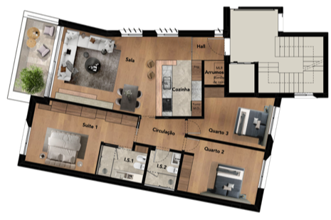Roupeiros com portas em madeira, com puxadores salientes na mesma cor. Apontamentos de contraste entre acabamentos mate e acetinado. Suite com ligação directa ao terraço e vista panorâmica sobre o Castelo de Leiria